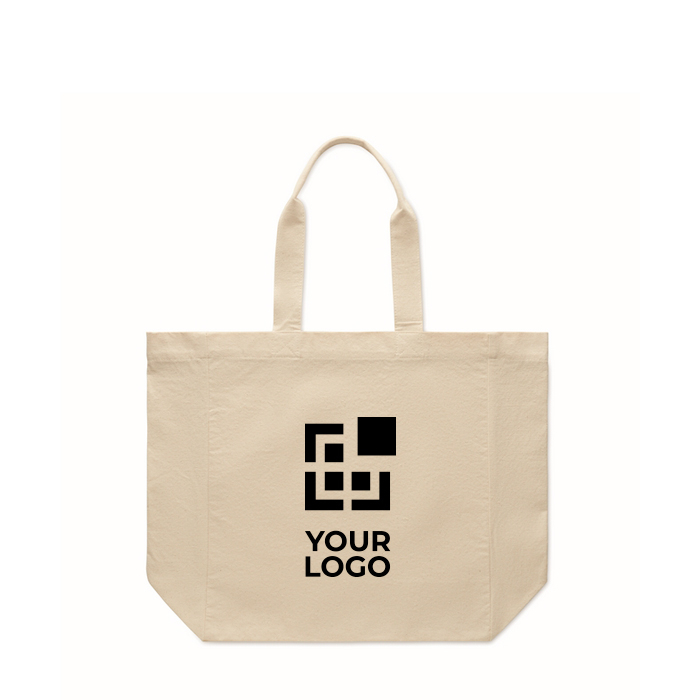 Saco tote de algodão de 220 g/m2 com asas curtas e fole, concebido para uso diário em compras e eventos. O tecido grosso dá-lhe boa consistência e ajuda a manter a forma quando está cheio. O fole adiciona capacidade útil para transportar catálogos, documentação ou pequenos produtos sem que o saco se deforme. As asas curtas facilitam o transporte à mão ou no antebraço. Opção prática para feiras, lojas e ações de merchandising corporativo.