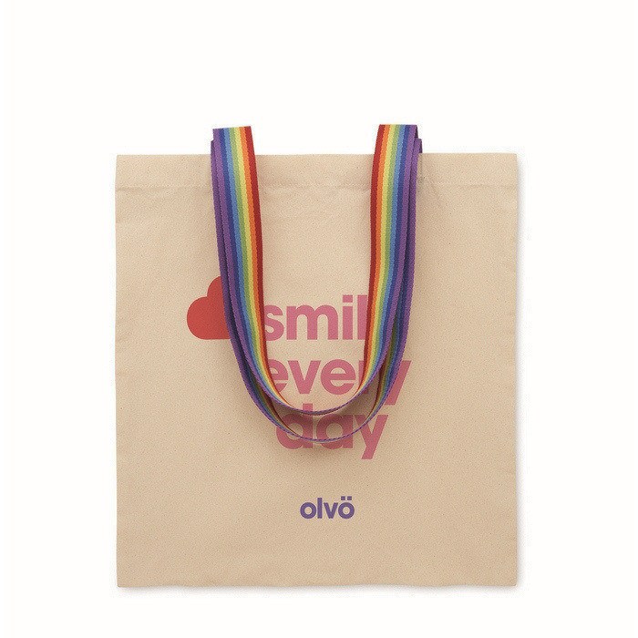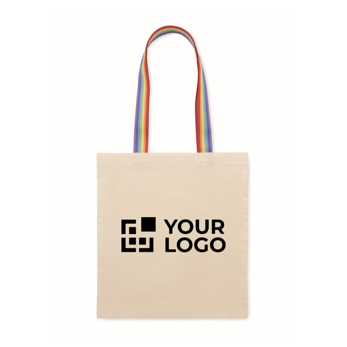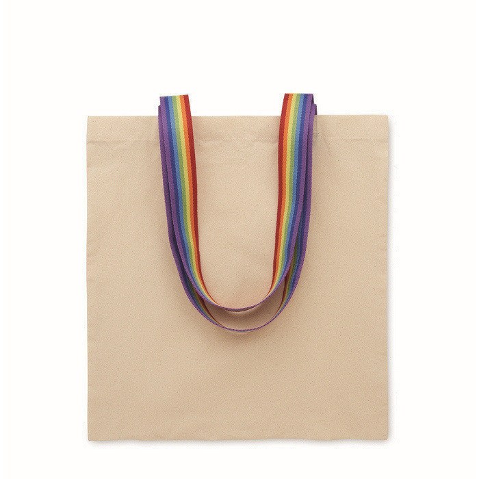 Saco tote de algodão de 180 g/m2 com asas com as cores do arco-íris para transporte diário. O tecido proporciona um toque consistente e apresentação limpa, adequada para eventos e uso recorrente. Inclui asas resistentes para levar ao ombro ou na mão e formato prático para compras ou material de escritório. Aguenta até 2,5 kg, ideal para artigos leves. Recomendável como apoio ao merchandising ou saco de entrega em feiras, lojas e ações de marca.