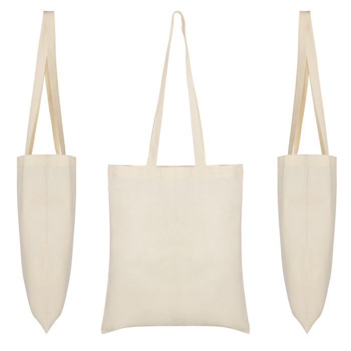 Um saco de algodão de cor natural e design simples. As asas compridas proporcionam conforto e a superfície oferece uma ampla área de marcação para o seu logo.