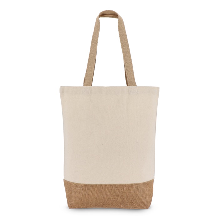 Saco duradouro com painéis dianteiro e traseiro de lona de algodão e fole inferior de juta, tudo de 320 g/m². Certificação OEKO-TEX® para materiais seguros e testados. Uma opção prática e elegante para lojas, eventos ou uso diário.