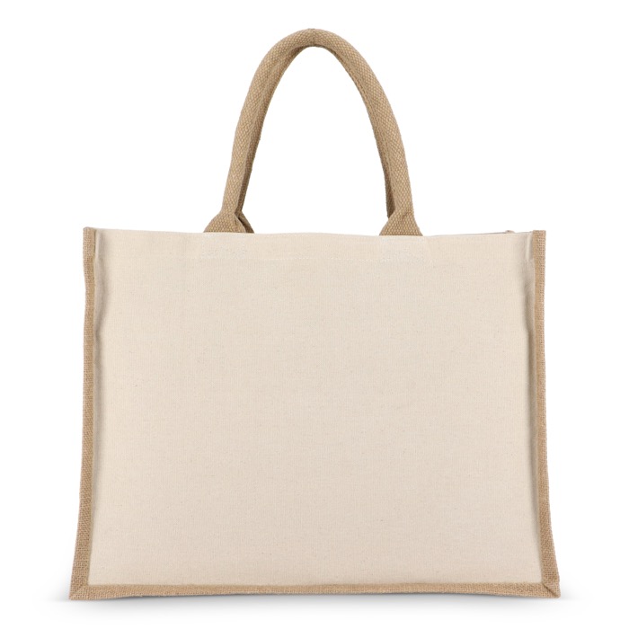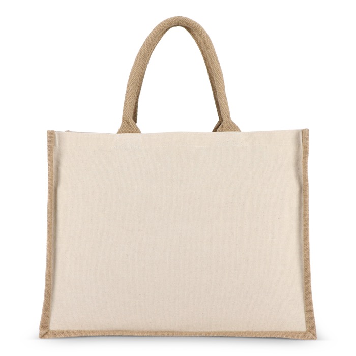 Saco feito com painéis dianteiro e traseiro de lona de algodão natural combinados com laterais e fundo de juta, tudo de 320 g/m². Equipado com asas de algodão coloridas a condizer para um aspecto combinado e natural. Certificação OEKO-TEX®. Ideal para lojas, eventos ou uso diário.