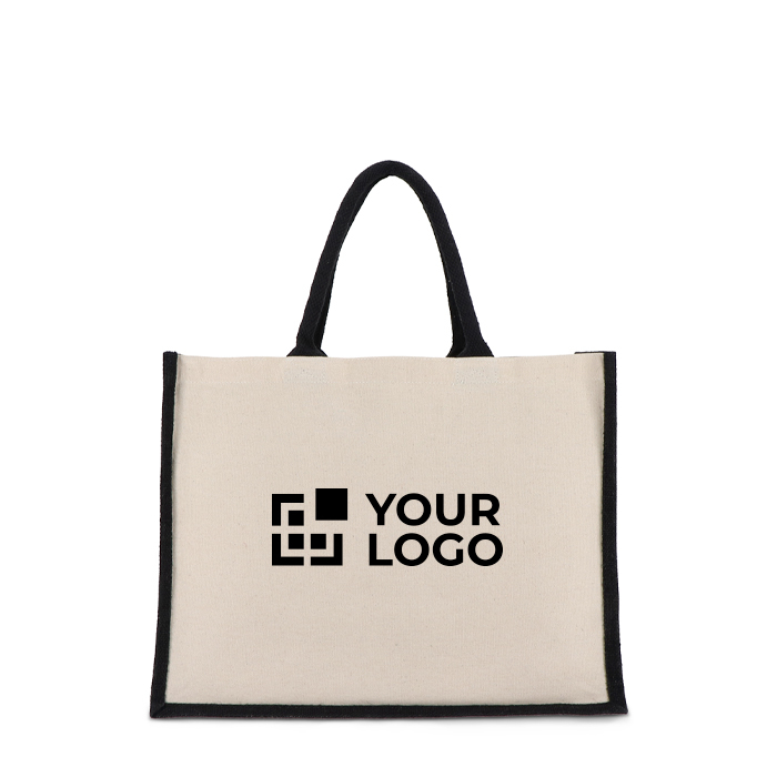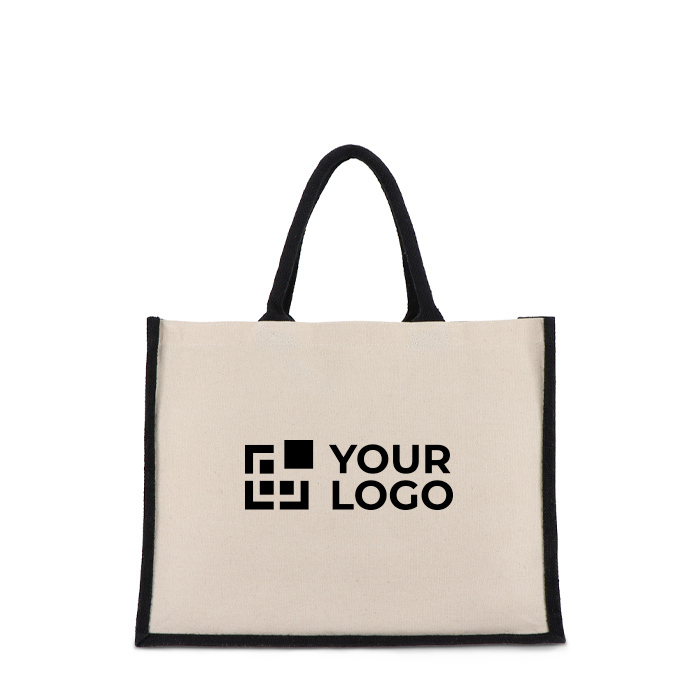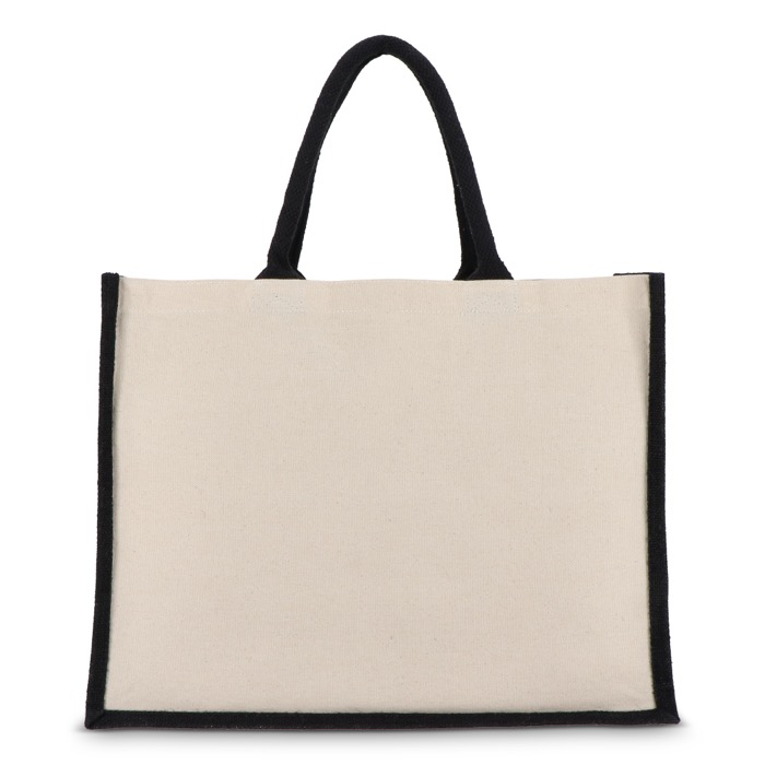 Elegante saco com painéis dianteiros e traseiros de lona de algodão e laterais e fundo de juta de 320 g/m². Acabamento com asas de algodão e painéis laterais em cores acentuadas para ser mais apelativo visualmente. Certificação OEKO-TEX®. Ideal para lojas, eventos ou uso diário.