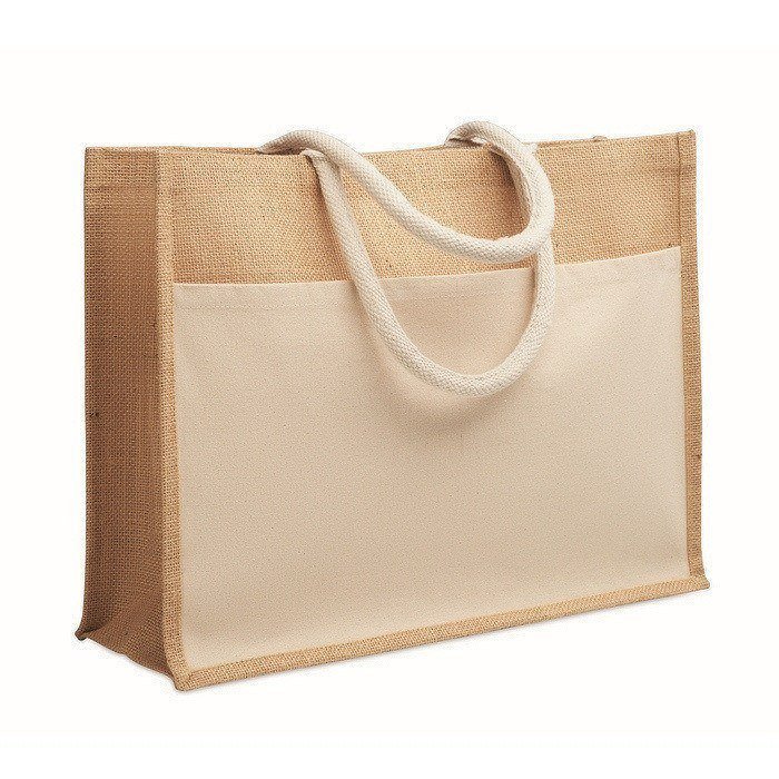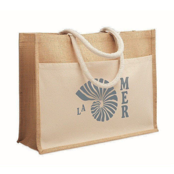 Saco de compras ou praia de juta laminada e lona de algodão de 280 g/m2, pensado para uso diário e repetido. Combina um corpo resistente com asas de cordão com fixação confortável na mão ou ao ombro. Inclui um grande bolso frontal aberto, prático para guardar documentos, folhetos ou pequenos artigos que convém ter à mão. Devido ao seu tamanho e estrutura, é adequado para feiras, ofertas de boas-vindas ou ações de merchandising em pontos de venda.
