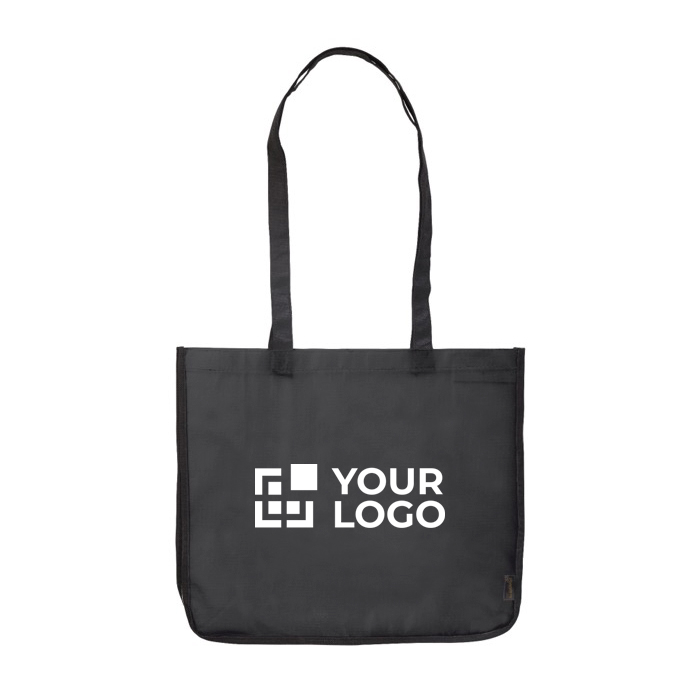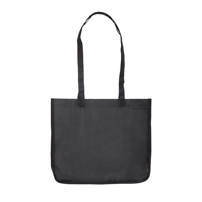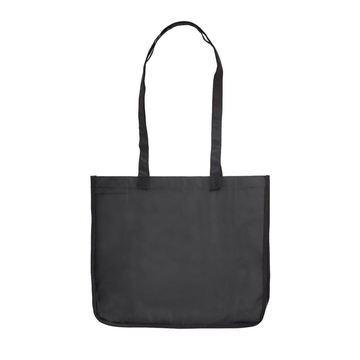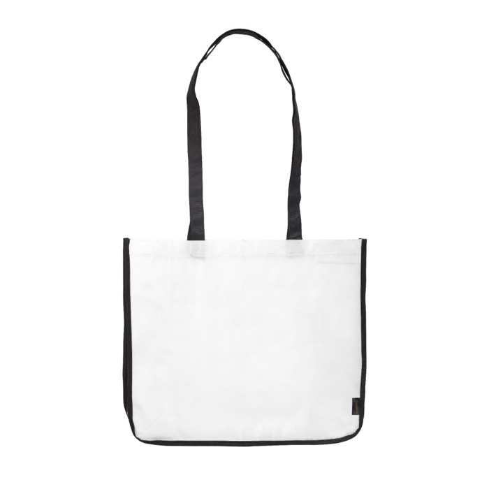 Saco grande para compras fabricado em PP non woven laminado, com laterais em branco e alças resistentes em preto.