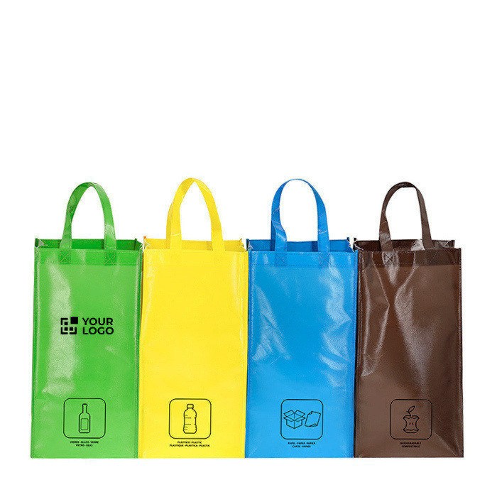 Conjunto de 4 sacos de reciclagem de non-woven laminado de 125 g/m² com acabamento brilhante, desenhado para separar resíduos ordenadamente no escritório ou armazém. Inclui 3 sacos de 23 x 45 x 23 cm unidos entre si com velcros laterais resistentes e uma quarta unidade para completar a classificação. As asas reforçadas facilitam o transporte e uso diário. Cada saco dispõe de indicação do tipo de resíduo: plástico e embalagens, orgânico, vidro e papel. Opção prática para campanhas internas e eventos corporativos.