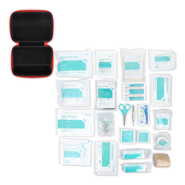 Kit de primeiros socorros com estojo de borracha suave e resistente, pensado para responder rapidamente a acidentes comuns. Cumpre as normas europeias e inclui material variado para curar feridas, queimaduras e entorses. Inclui gás, compressas, toalhitas e álcool, pensos-rápidos e pensos tipo ilha, gel para queimaduras, ligaduras elásticas e coesivas, além de tesoura, pinça, alfinetes, luvas e máscara para RCP. Dispõe também de manta de emergência, saco de gelo instantâneo e fita médica adesiva. Opção prática para escritórios, viagens corporativas e atividades de equipa.