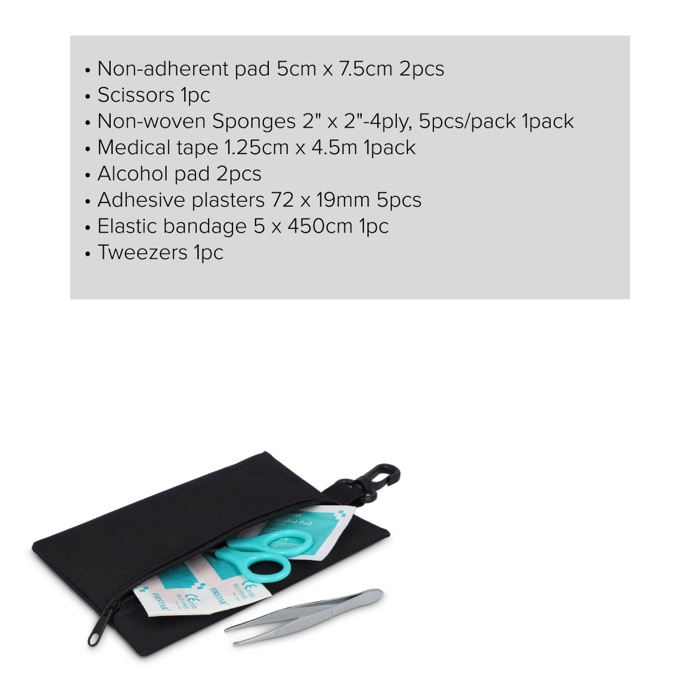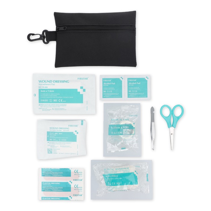 Kit de primeiros socorros em bolsa de poliéster 300D com mosquetão, concebido para levar o essencial de forma ordenada e acessível. Cumpre as normas europeias e é útil em deslocações, atividades ao ar livre ou como apoio no veículo e escritório. Inclui compressas não adesivas, tesoura, esponjas non-woven, fita médica adesiva, toalhetes com álcool, pensos-rápidos, ligadura elástica de crepe e pinça para tratar cortes, arranhões e pequenos acidentes. Opção prática para ações de segurança no trabalho, eventos desportivos ou formação interna.