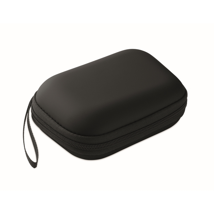 Kit de primeiros socorros em estojo duro de PU, desenhado para manter o conteúdo protegido e organizado. Inclui 2 luvas, 1 manta de emergência, 1 adesivo médico, 2 ligaduras, 4 cotonetes, 10 pensos-rápidos e 6 toalhitas, cobrindo necessidades básicas em pequenos incidentes. Formato compacto e fácil de guardar numa gaveta, veículo ou área comum. Venda indisponível fora da UE. Adequado para kits corporativos, zona de receção ou ações de prevenção na empresa.