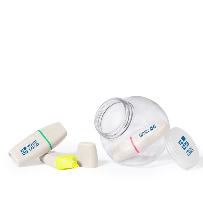 Frasco de corpo transparente e tampa branca com rosca que contém 3 marca-textos fluorescentes. Os marca-textos são feitos de cana de trigo e ABS e estão disponíveis em amarelo, verde e rosa fluorescente.