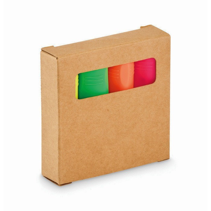 Conjunto de marca-textos fluorescentes em caixa kraft, pensado para uso diário no escritório, salas de reuniões ou formação. Inclui 4 cores para sublinhar, realçar e organizar a informação com rapidez em documentos impressos. A caixa de cartão kraft facilita o armazenamento e distribuição em eventos ou kits corporativos. Formato compacto para levar na mochila, gaveta ou junto ao material de papelaria. Escolha prática para ações de boas-vindas, feiras ou entregas internas.